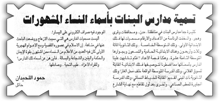 جاء توجيه سمو وزير التربية والتعليم نهاية الأسبوع الماضي لجميع إدارات التربية والتعليم بمناطق ومحافظات المملكة باعتماد تغيير مسميات مدارس البنات المحدثة من أرقام متسلسلة إلى أسماء ذات دلالة معنوية وتاريخية من خلال تعميم مرفق بدليل أعدته الوزارة مؤخراً، وصدرت موافقة المقام السامي عليه. جاء هذا التوجيه متوافقاً مع المُقترح الذي طرحته (الجزيرة) قبل ما يُقارب الـ 13 عاماً، وتحديداً في يوم السبت 2 ربيع الثاني 1422هـ ، العدد 10495 بعنوان (تسمية مدارس البنات بأسماء النساء المشهورات)؛ جاء في جزئه الأخير «أليست مسميات المدارس هي التي سببت الإزعاج ووضعت الباحث عنها في متاهة.. إن الإسلام في عصوره الماضية ومع الأعوام الهجرية الأولى كان فيه العديد من الأعلام من النساء ممن اشتهرن بقوة الإيمان والحكمة واليقين والشجاعة والبسالة.. فأين هن عن أسماء تلك المدارس؟».