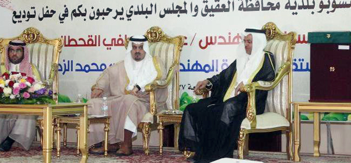 ثم ألقى المحتفى به المهندس القحطاني، كلمة شكر خلالها الإدارات الحكومية وعلى رأسهم المحافظ، ثم ألقى أبو خشيم، كلمة أثنى فيها على الجهود التي بذلها المهندس عوض القحطاني، طيلة فترة عمله، ورحب بالرئيس الجديد لبلدية العقيق.