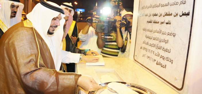 بعد ذلك قام سموه بزيارة لمنزل الأستاذ محمد عبد العزيز الحبردي حيث كان في استقباله مرحبًا بهذه الزيارة، ثمَّ توجه سموه لافتتاح وقف الوالدين لتعليم القرآن الكريم وكان في استقباله محافظ البدائع ورئيس جمعية تحفيظ القرآن الكريم فضيلة الشيخ محمد السحيباني والشيخ سليمان العبيد وعدد من أعيان المحافظة حيث وضع سموه حجر الأساس للمشروع واستمع سموه إلى شرح عن المشروع وأهدافه الخيرية، ثمَّ بعد ذلك توجه سموه لافتتاح مركز البيان لتحفيظ القرآن في محافظة البدائع حيث كان في استقبال سموه لدى وصوله محافظ البدائع عبد الرحمن السديس ورئيس مجلس إدارة جمعية تحفيظ القرآن الشيخ محمد بن صالح السحيباني ومدير مركز البيان الأستاذ محمد خليفة الصقيه وجمع من أعضاء ومنسوبي الجمعية ومعلمي المركز، وبعد أن أزاح سموه الستار إيذانًا بافتتاح المركز تحدث الأستاذ الصقيه شارحًا قصة البداية ومراحل النجاح وثمار التخطيط التي حققها المركز عبر لغة الأرقام منذ تأسيسه عام 1428هـ حيث يعد الأول من نوعه في المنطقة، ثمَّ تجوَّل سموه داخل المركز مطلعًا على غرف التدريس وطريقة التَّعليم عبر القاعدة النورانية التي يتعلم فيها الطفل قراءة القرآن الكريم قبل مرحلة دخوله في التَّعليم العام، ثمَّ وقف سموه على أنموذج حي لأحد الدروس.