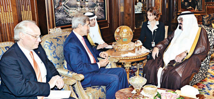 استقبل خادم الحرمين الشريفين الملك عبد الله بن عبد العزيز آل سعود - حفظه الله - في قصره بالرياض أمس معالي وزير الخارجية الأمريكي جون كيري والوفد المرافق له.