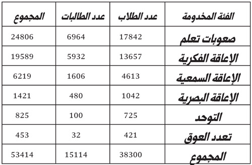لذلك فانه من الصعوبة بمكان تحديد تلك الفئات ونسبها واعدادها في المجتمع المدرسي السعودي. غير أنه لا مفر من استخدام النسب والتقديرات العالمية لقراءة واقعنا ومحاولة تقديم صورة تقريبية عن وضع التربية الخاصة في المملكة لذلك فإن أي لغة أرقام في هذا المجتمع سوف تقوم على النسب العالمية الافتراضية التي سوف أستخدمها في مقالتي، فمن المتعارف عليه دولياً أن نسبة انتشار الإعاقة في المجتمع المدرسي تمثل حوالي 10% وبمعادلة بسيطة إذا كان لدينا (4.904.777) طالب وطالبة في المجتمع المدرسي السعودي من مرحلة رياض الأطفال حتى نهاية المرحلة الثانوية للعام 1434-1435هـ حسب إحصائيات وزارة التربية والتعليم. فإنه سيكون لدينا تقريباً خمسمائة ألف طفل ذي إعاقة في المجتمع المدرسي، غير أن الذين يتلقون خدمات التربية الخاصة ضمن نطاق وزارة التربية والتعليم حوالي (38300) طالب، (15114) طالبة وبمجموع يشكل حوالي (53414) ويبين الجدول التالي توزيع الفئات المخدومة وعدد كل فئة مخدومة تحت مظلة وزارة التربية والتعليم مرتبة تنازلياً - حسب إحصائيات وزارة التربية والتعليم للعام 1433-1434هـ: