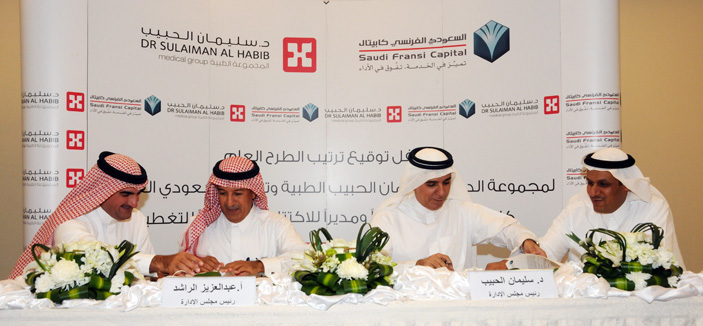 أعلنت مجموعة الدكتور سليمان الحبيب الطبية عن تعيين «السعودي الفرنسي كابيتال» مستشاراً مالياً ومديراً للاكتتاب ومتعهداً للتغطية لطرح أسهم المجموعة للاكتتاب العام، وذلك بموجب اتفاقية تم توقيعها مساء أمس الأول. وحضر حفل التوقيع كلٌ من رئيس مجلس الإدارة الدكتور سليمان بن عبد العزيز الحبيب وأعضاء مجلس إدارة المجموعة، ومن جانب «السعودي الفرنسي كابيتال» كلٌ من رئيس مجلس الإدارة عبد العزيز الراشد والعضو المنتدب ياسر الرميان.وأوضح الدكتور سليمان الحبيب أن المجموعة العاملة في مجال الرعاية الطبية بدأت نشاطها منذ عام 1995، وقد استمرت في تحقيق معدلات نمو عالية خلال السنوات الماضية واستطاعت أن تستحوذ على حصة سوقية مهمة في الأسواق التي تعمل بها، كما أن عملية طرح أسهمها للاكتتاب العام تُعد نقطة تحول في مسيرتها وخطوة حيوية على طريق توجهها الإستراتيجي للتوسع.. كما نوّه «بأن الطرح العام خطوة كبيرة وجزء من إستراتيجيتنا التي تهدف إلى توسيع قاعدة المساهمين ومشاركة المواطنين في استثمارات ونشاطات ومدخولات الشركة، وبالتالي مواصلة نموها وتوسع أنشطتها».