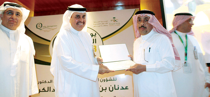 أشاد الدكتور عدنان بن سليمان العبدالكريم مدير عام الشؤون الصحيَّة بمنطقة الرياض بالمشاركة الفعَّالة من قبل العاملين بالمجال الطّبي من الأطباء وهيئة التمريض ومن الاختصاصيين والفنيين ضمن فعاليات «يوم الجودة» الذي يهتم بتطوير جودة الخدمات الطّبية وتحسين أدائها بشكل يرضي المرضى.