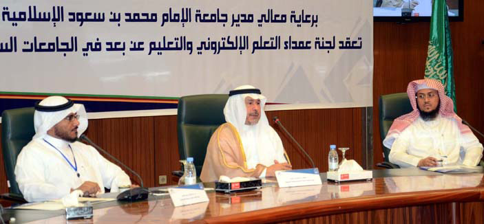 تحت رعاية مدير جامعة الإمام محمد بن سعود الإسلامية الدكتور سليمان أبا الخيل افتتح وكيل الجامعة لخدمة المجتمع وتقنية المعلومات الدكتور فوزان بن عبدالرحمن الفوزان أمس أعمال لجنة عمداء التعليم الإلكتروني والتعليم عن بعد في الجامعات السعودية في اجتماعها الأول الذي نظمته عمادة التعلم الإلكتروني والتعليم عن بعد بجامعة الإمام محمد بن سعود الإسلامية.