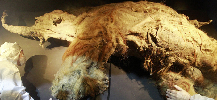 مجموعة من الأشخاص بملابس وقائية يفحصون مومياء لأنثى (الماموث) التي توفيت بعمر عشر سنوات قبل نحو 39 ألف سنة في منطقة سيبيريا، طبقا لما قاله المنظمون لمعرض «الماموث الصوفي المجمّد».