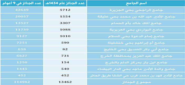 بدأ عام جديد 1435هـ ومعه تبدأ تباشير الخير والسعادة والأمل للناس، وانقضى عام 1434هـ وقد طوي عام مليء بين الفرح والحزن وسعادة ناس وتعاسة آخرين، وهكذا الحياة، وقد رصدت جريدة الجزيرة عددا من الجنائز التي ووريت تحت الثري، وقد صلي عليها صلاة الميت في الجوامع العشرة المعتادة، ثمانية في العاصمة الرياض إلى جانب اثنين في محافظة الخرج .. ومن خلال إحصائية يومية تابعتها (الجزيرة) ففي عام 1424هـ ودعنا 8000 جنازة وفي عام 1425هـ ودعنا 9859 جنازة, وفي عام 1426هـ ودعنا 10373 جنازة وفي عام 1427هـ 11500جنازة , وفي عام 1428هـ 11591 جنازة, وفي عام 1429هـ ودعنا 13031 جنازة, وفي عام 1430هـ ودعنا 12893جنازة, في عام 1431 ودعنا 12990جنازة، وفي العام 1433 هـ ودعنا 13462 جنازة. وفي العام المنصرم 1434هـ ودعنا 13462 جنازة رحلوا عن الدنيا. هذا وقد طويت صحائف من ودعونا العام الماضي لمختلف الأعمار من الرجال والنساء والأطفال فكانت جثامينهم على النحو التالي: