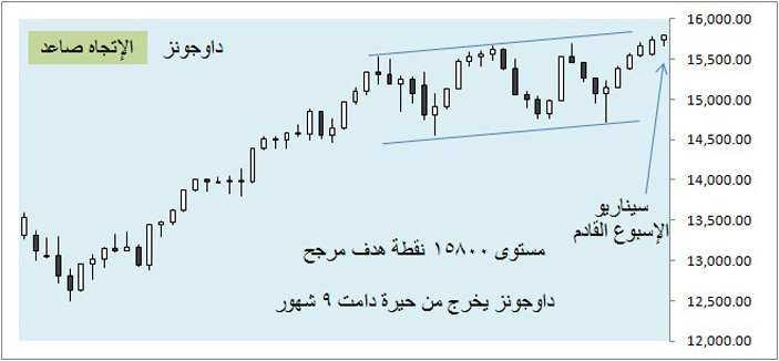 أعلن مؤشر الداوجونز هذا الأسبوع خروجه من منطقة حيرة دامت تسعة شهور هذه الحيرة التي نتحدث عنها كانت على المدى المتوسط، وهذا الأسبوع سجل رقم تاريخي جديد وهو 15787 نقطة وأنهى التعاملات بنمط شرائي ومسار صاعد على مستوى الحركة الأسبوعية واليومية، ونرجح الأسبوع المقبل بأن يحاول تشييد قمة تاريخية جديدة عند 15800 نقطة لكن بنمط شرائي أضعف من الأسبوع المنصرم دعمه 15658 نقطة.