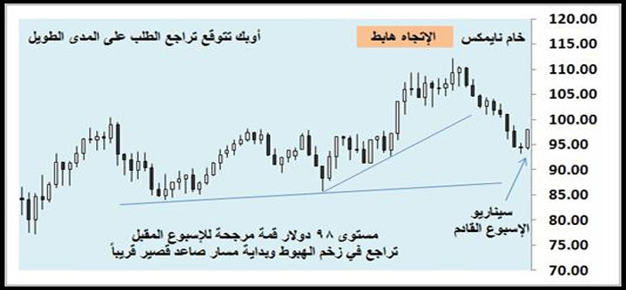 انتهى الأسبوع بنمط متوازن توازنت فيه قوى البيع مع قوى الشراء بعد مسار هابط طويل على مستوى الحركة الأسبوعية توج بتقرير من أوبك يتحدث عن تراجع متوقع للطلب على النفط على المدى الطويل، لكن رغم سلبية بعض المؤشرات الاقتصادية العالمية إلا أن تجار النفط يميلون لتنشيط الخامات خصوصاً بعد عودة الذهب والدولار للحيرة، لذا نرجح أن يبدأ خام نايمكس مساراً صاعداً قصيراً يستهدف مستوى 98 دولاراً والإغلاق عنده.