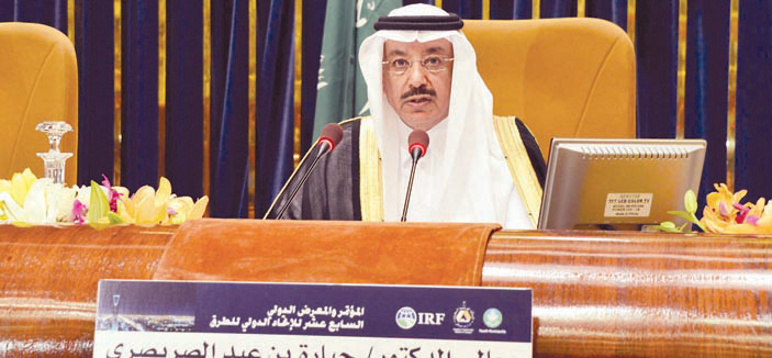 نيابة عن خادم الحرمين الشريفين الملك عبد الله بن عبد العزيز آل سعود - حفظه الله - افتتح معالي وزير النقل الدكتور جبارة بن عيد الصريصري مساء أمس أعمال المؤتمر والمعرض الدولي السابع عشر للاتحاد الدولي للطرق ، الذي يستمر لخمسة أيام ، وذلك بقاعة الملك فيصل للمؤتمرات بفندق الانتركونتنتال بالرياض .