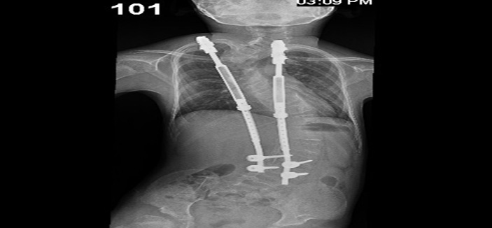 وأوضح د. الحنيطي بأنه تم إخضاع الطفل للفحوصات المخبرية وأشعة الرنين المغناطيسي (M.R.I) والتصوير المقطعي المحوري (C.T. Scan) والأشعة العادية (X-Rays) حيث أوضحت النتائج وجود ميلان حاد بالعمود الفقري بزاوية إنحناء قدرها 80 درجة في إتجاه اليمين بالفقرة القطنية الأولى وانحراف آخر في الفقرة الصدرية الخامسة بزاوية انحراف (65) درجة.
