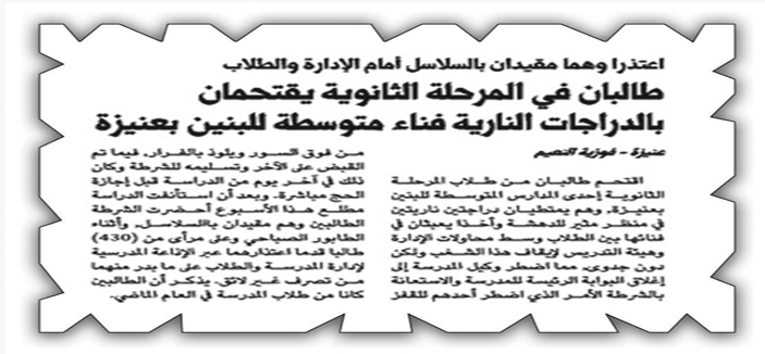 وإشارة إلى ما نُشر في صحيفتكم الموقرة في يوم الأربعاء 18-12-1434هـ والموافق 23-10-2013م في عددها (15000) للكاتبة فوزية النعيم، تحت عنوان (اعتذرا وهما مقيدن بالسلاسل أمام الإدارة والطلاب....).
