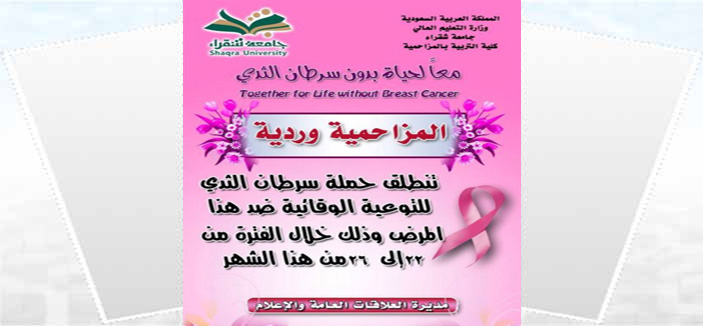 انطلقت صباح أمس الأول الحملة التوعوية لسرطان الثدي تحت شعار (المزاحمية وردية) ودشنت الحملة الدكتورة أسماء فراج العتيبي عميدة كلية التربية بمحافظة المزاحمية وبإشراف من مديرة العلاقات العامة الدكتورة موضي العتيبي ومشرفة الأنشطة الطلابية الدكتورة جوزاء العتيبي. ويعتبر التدشين انطلاقا للحملة التي ستقام لمدة خمسة أيام يتخللها العديد من الفعاليات والعروض المرئية لتوجيه الرسالة التوعوية المرجو نشرها للسيدات بدءاً من نشر الوعي. حيث تتضمن الأساليب العلمية للكشف وتخفيف الآثار النفسية والاجتماعية المترتبة على الإصابة بالمرض. بالإضافة إلى تدريب الطالبات على الفحص الذاتي للكشف المبكر عن السرطان لحمايتهن.