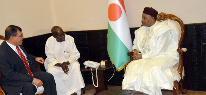 استقبل فخامة رئيس النيجر محمد يوسفو في قصر الرئاسة في نيامي مساء أمس الجمعة سفير خادم الحرمين الشريفين لدى النيجر سعود بن عبدالعزيز الدايل، وقد نقل السفير تحيات وتمنيات خادم الحرمين الشريفين وولي عهده -حفظهما الله- وسمو النائب الثاني بدوام الصحة لفخامته واستمرار النمو والازدهار لشعب النيجر الشقيق.