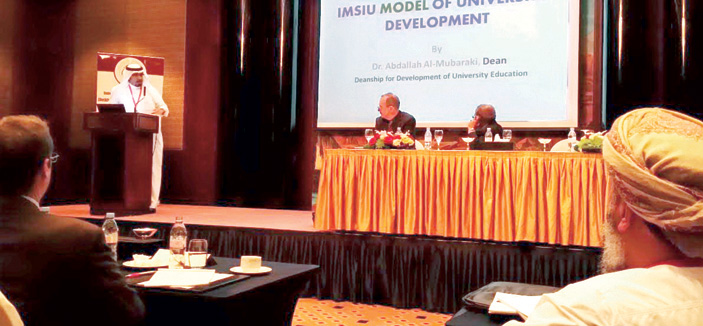 شارك عميد التطوير الجامعي بجامعة الإمام محمد بن سعود الإسلامية الدكتور عبدالله المباركي في المنتدى الإقليمي لقيادات التعليم العالي 2013م، الذي عقد في دبي خلال الفترة من 12-13/ 2013م تحت رعاية وزير التعليم العالي والبحث العلمي صاحب السمو الشيخ حمدان بن مبارك آل نهيان، بورقة عمل عن «نموذج جامعة الإمام محمد بن سعود الإسلامية في التطوير الجامعي» (IMSIU Model of University Development)، عرض من خلالها نبذة عن الجامعة والتطور الكبير الذي شهدته في جميع المجالات الأكاديمية والمؤسسية والتخطيط الإستراتيجي والقفزة النوعية في التعليم الجامعي الذي يحظى بالدعم المستمر والمتابعة من معالي مدير الجامعة الأستاذ الدكتور سليمان بن عبدالله أبا الخيل وقيادته للجامعة نحو التطوير والتحسين المستمر مع الإبقاء على الثوابت التي تقوم عليها الجامعة ودورها الرائد محليا وعالميا، مما انعكس ذلك إيجاباً على تطوير العملية التعليمية بجميع محاورها: الأستاذ والطالب والمناهج وبيئة التعلم.
