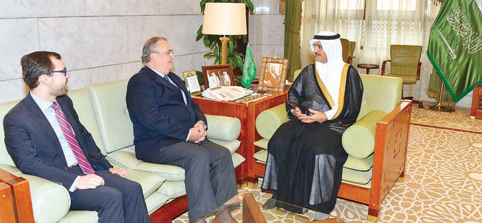 استقبل صاحب السمو الملكي الأمير خالد بن بندر بن عبد العزيز أمير منطقة الرياض في مكتب سموه بقصر الحكم أمس، سفير إسبانيا لدى المملكة خواكين بيرث.