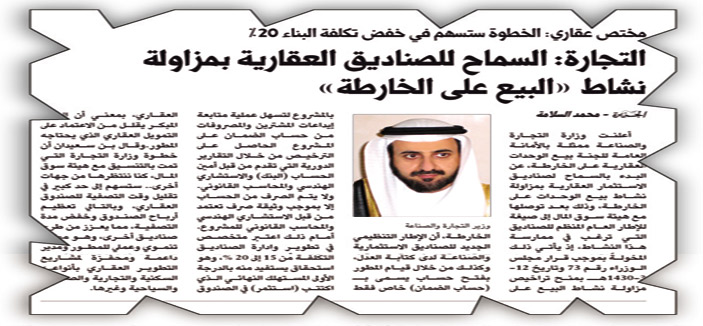 وأضاف العلوان أن السماح للصناديق بالبيع على الخارطة سيحدث ثورة في صناعة العقار، من حيث توفيرها للمساكن بأنواعها والأبراج السكنية والمشاريع التجارية ويساعد على تنظم العقار كقطاع حيوي يدعم ويعزز فرص استقطاب استثمارات عالمية ومشاركات عريضة من الجمهور، عبر تلك الصناديق التي تخضع لإدارة شركات مالية مهنية متخصصة ذات درجة عالية من الكفاءة والخبرة.