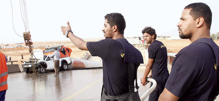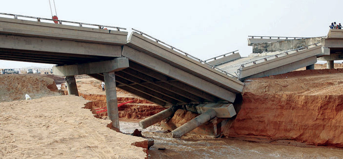 تفاجأ سكان الرياض أمس بانهيار جسر الثمامة شرق العاصمة، وهو ما أثار موجة مخاوف من وضع بعض الجسور خصوصاً تلك التي تقع في مجاري الأودية. وقال المتحدث الإعلامي بمديرية الدفاع المدني في منطقة الرياض النقيب محمد الحمادي إن الدفاع المدني باشر الحادثة بعد تلقي غرفة العمليات بلاغاً عن انهيار الجسر واحتجاز أشخاص. وبين النقيب الحمادي أنه تم تحرير احتجاز ثلاثة أشخاص ونقلهم إلى المستشفى أحدهم إصابته طفيفة واثنان متوسطة، مشيراً الى أنه بالرغم من صعوبة وخطورة الحادث كون احدى السيارات شاحنة وقود فقد تم تحرير المحتجزين في وقت قياسي، مبيناً أنه تم إخراج السيارات من الموقع. من جانبه، قال المتحدث الرسمي بمرور منطقة الرياض المقدم حسن بن صالح الحسن إن الكبري يخدم جميع ناقلات النفط الخاصة من محطة أرامكوا الى جميع المحطات الخاصة للوقود في مدينه الرياض، مؤكداً إغلاق الجسر من بوابة المطار الشرقية (تقاطع البوابة الشرقية) على طريق الطيران الخاص باتجاه الشمال وحتى دوار الأمير أحمد طريق الطيران الخاص، كونه امتداداً لطريق من دوار العويضة باتجاه الشمال وصولاً إلى مزرعة خزام.