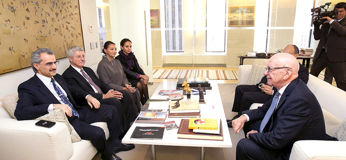 التقى صاحب السمو الملكي الأمير الوليد بن طلال بن عبد العزيز آل سعود، رئيس مجلس إدارة شركة المملكة القابضة ومجموعة روتانا في المقر الرئيسي لشركة نيوزكورب News Corp بولاية نيويورك، بالسيد روبيرت موردوخ رئيس مجلس الإدارة التنفيذي لشركة نيوزكورب News Corp كما يشغل منصب رئيس مجلس الإدارة والرئيس التنفيذي لشركة فوكس 21st Century Fox. وقد حضر الاجتماع الأستاذ شادي صنبر المدير التنفيذي والمدير المالي لشركة المملكة القابضة وعضو لجنة الاستثمار والأستاذة هبة فطاني، المديرة التنفيذية الأولى، لإدارة العلاقات والإعلام والدكتورة نهلة ناصر العنبر المساعدة التنفيذية الخاصة لسمو رئيس مجلس الإدارة والأستاذ نايف حسام الزهير، مدير المواقع والشبكات الإلكترونية والأستاذ فهد بن سعد بن نافل، المساعد التنفيذي لسمو رئيس مجلس الإدارة.