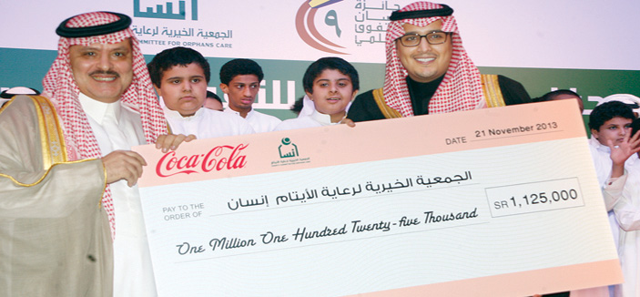 تسلم صاحب السمو الملكي الأمير أحمد بن فهد بن سلمان بن عبدالعزيز (رئيس اللجنة التنفيذية بالجمعية الخيرية لرعاية الأيتام في منطقة الرياض إنسان) شيكاً بقيمة (1.125.000) مليون ومائة وخمسة وعشرين ألف ريال، تمثل عائدات حملة كوكاكولا الرمضانية.. التي خصصت لبناء وتجهيز ملاعب ومرافق ترفيهية لأبناء الجمعية، إذ سلم الشيك من جانب شركة تعبئة كوكاكولا في المملكة العربية السعودية مساعد مدير عام الشركة الأستاذ عبدالله العراك.