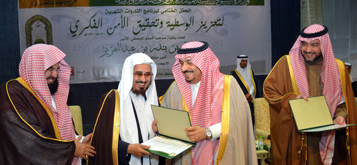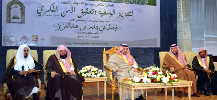 وقد أشاد صاحب السمو الملكي امير منطقة القصيم بالجهود الملموسة والمثالية التي تقدمها وزارة الشؤون الإسلامية والأوقاف والدعوة والإرشاد ممثلةً بوكالة شؤون الدعوة والإرشاد من خلال تقديم ندوات شهرية ، لتعزيز الوسطية وتحقيق الأمن الفكري ، مشيراً سموه إلى أن ذلك يأتي وفقاً لتوجيهات خادم الحرمين الشريفين - حفظه الله - الذي كان ولايزال حريصاً على ترسيخ مفاهيم الوسطية والتعايش السلمي لتكون شرعة ومنهجاً لهذه البلاد.
