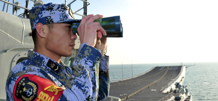 - جندي بحري مِنْ جيش التحرير الشعبي الصينيِ (بي إل أي) يقوم بمهمة استطلاعية من على متن حاملة طائرات الصين الأولى «Liaoning» والتي تقوم بزيارة ميناء عسكري على بحر جنوب الصين . (رويترز)