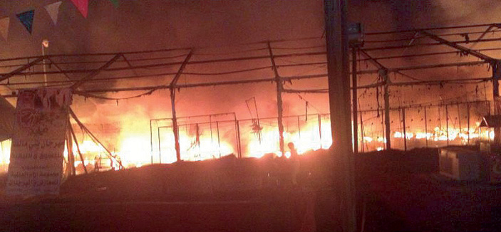 باشرت فجر أمس خمس فرق إطفاء وإسعاف وإنقاذ من الدائر وفيفا وجبال الحشر والعيدابي والظبية حريقاً نشب في خيمة تسوق تابعة لمهرجان البن في محافظة الدائر بني مالك وتمكنهم من إخماد الحريق دون حدوث أي إصابات. وأوضح الناطق الإعلامي لمديرية الدفاع المدني بمنطقة جازان الرائد يحيى القحطاني أنه تم استلام بلاغ بالحادثة من قبل القيادة والسيطرة في تمام الساعة 2.42 فجر اليوم وتم انتقال فرقة الدفاع المدني بالدائر وتم دعم الموقف بأربع فرق إضافية من فيفا والعيدابي وجبال الحشر والظبية وتم إخماد الحريق الذي جاء على كامل الخيمة التي تبلغ مساحتها 20×70 متراً دون أي إصابات أو وفيات. وأشار الرائد القحطاني إلى أنه تمت مباشرة جميع الجهات ذات العلاقة للموقع وتمت إحالة الحادث للشرطة لإكمال اللازم عن طريقهم نظراً لوجود شبهة جنائية في الحادث.