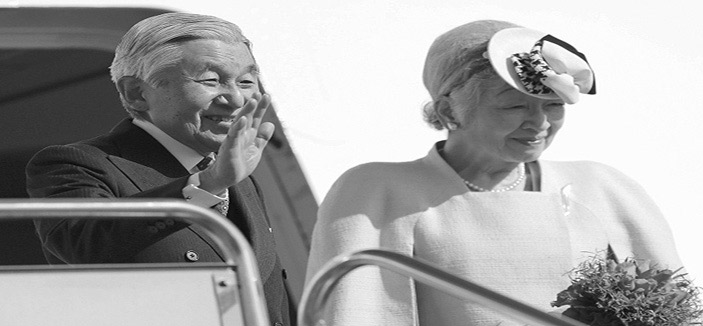 - طوكيو: إمبراطور اليابان أكيهيتو والإمبراطورة ميتشيكو أثناء صعودهما طائرة خاصّة متوجهَين إلى الهند في زيارة رسمية تستغرق ستة أيام. (رويترز)