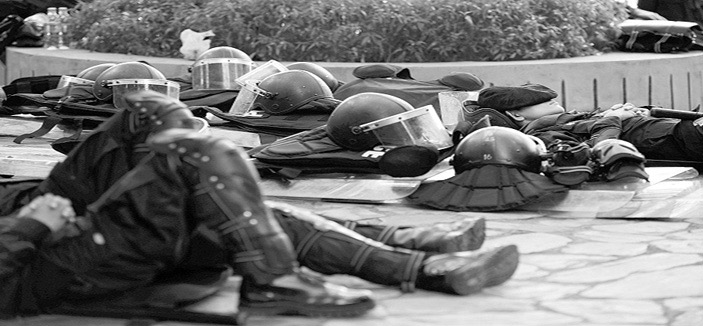 - بانكوك: أفراد من شرطة مكافحة الشغب التايلاندية يأخذون قيلولة في حديقة عامة أثناء فترة هدوء في المظاهرات في العاصمة بانكوك. (رويترز)