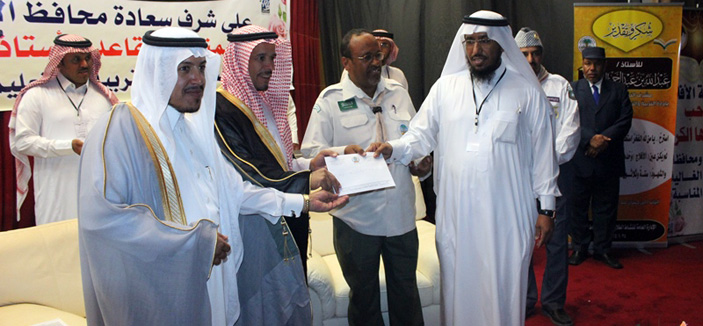 بعدها افتتح المحافظ بداية الهدايا والدروع المقدمة له بدرع مقدم منه ومن مدير تعليم الأفلاج ثم كلمة مؤثرة وداعية للمحتفى به، ثم قلد أمين عام المساعد في جمعية الكشافة السعودية الدكتور صالح الحربي ورئيس لجنة العلاقات عبد العزيز السراء محمد آل شبيب الشارة الخشبية وانتهي الحفل بحفل العشاء الذي أعد بهذه المناسبة.