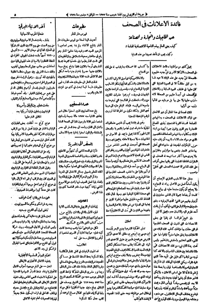 في العام (1357 هـ) نشرت الجريدة الرسمية أم القرى نصاً نفيساً بعنوان (فائدة الإعلانات في الصحف عن الحاجيات والتجارة والصناعة) وقد يكون هذا النص هو أقدم نص نشر في الصحافة السعودية عن أهمية الاعلان كونه وسيلة مهمة في التواصل بين التاجر والمستهلك..