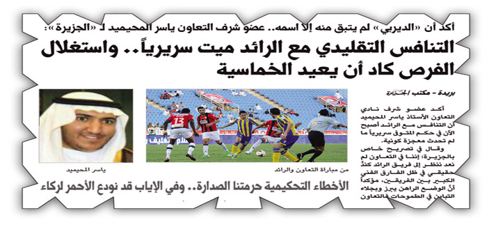 استغرب عضو مجلس الإدارة السابق بنادي الرائد الأستاذ محمد العجلان من مضامين التصريح الذي أطلقه ياسر المحيميد ونشرتــه صحيفة الجزيرة يوم أمس وفيه انتقاص لنادي الرائد بعد فوز فريق التعاون العابر بمباراة الفريقين..!
