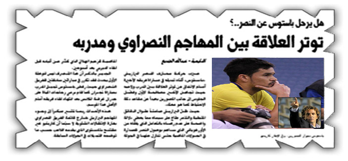 يذكر أن «الجزيرة» أشارت مسبقاً في عددها رقم15018 الصادر بتاريخ 6\1\1435هـ عن توتر العلاقة بين محترف النصر البرازيلي باستوس ومدربه لأوروغوياني كارينهو بسبب رفض الأول مصافحة الثاني وجلوسه بعيداً عن دكة احتياط فريقه ، ليلوح بالأفق قرار مغادرة اللاعب البرازيلي في فترة الانتقالات القادمة.