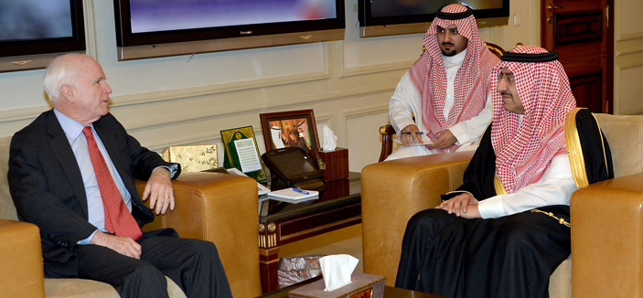 استقبل صاحب السمو الملكي الأمير محمد بن نايف بن عبدالعزيز وزير الداخلية في مكتبه بالوزارة في الرياض مساء أمس، عضو مجلس الشيوخ الأمريكي السيناتور جون ماكين، وجرى خلال الاستقبال بحث عدد من الموضوعات ذات الاهتمام المشترك بين البلدين. حضر الاستقبال القائم بأعمال السفارة الأمريكية بالرياض تيموثي لندركينج.