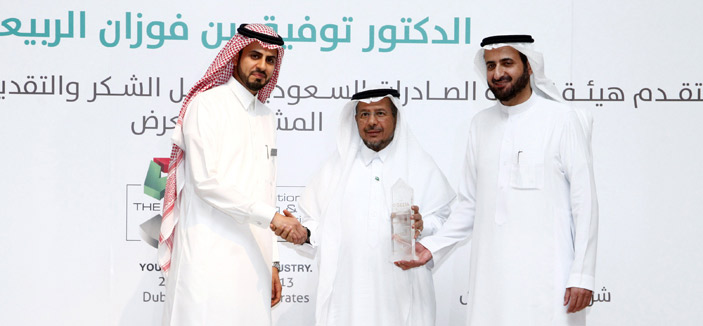 أشاد معالي الدكتور توفيق بن فوزان الربيعة، وزير التجارة والصناعة رئيس مجلس إدارة هيئة تنمية الصادرات السعودية، بجناح التصنيع في المعرض الدولي للبناء والأعمال الإنشائية (الخمسة الكبار)، الذي أقيم في دبي بالإمارات العربية المتحدة خلال الفترة 25-28/ نوفمبر 2013م. كما أشاد معالي الدكتور الربيعة بما حواه جناح التصنيع من منتجات متميزة، تسهم بقوة في تعزيز شعار (صنع في السعودية). جاء ذلك أثناء تكريمه لشركة التصنيع الوطنية ضمن الشركات المشاركة في المعرض.
