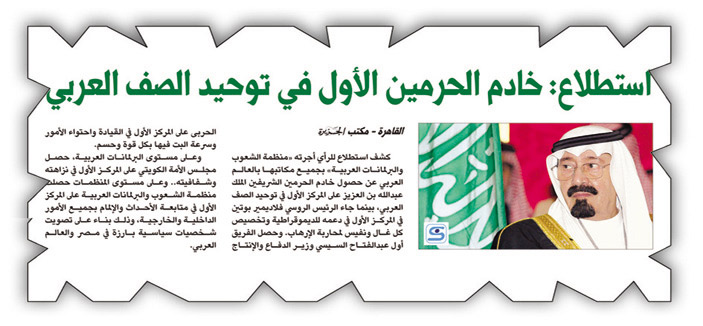 أكد عدد من أعضاء مجلس الشورى أن خادم الحرمين الشريفين الملك عبدالله بن العزيز يحمل هم الأمة وينظر إلى مستقبلها الواعد. وقالوا لـ»الجزيرة» بمناسبة حصول خادم الحرمين الشريفين على المركز الأول في توحيد الصف العربي الذي كشف عنه استطلاع للرأي أجرته «منظمة الشعوب والبرلمانات العربية» بجميع مكاتبها بالعالم العربي، الكل دعم خادم الحرمين الشريفين لتطور العالم والحفاظ على الأمن والسلام وتباين وجهات النظر ليصل إلى عالم تسوده المحبة والتفاهم.