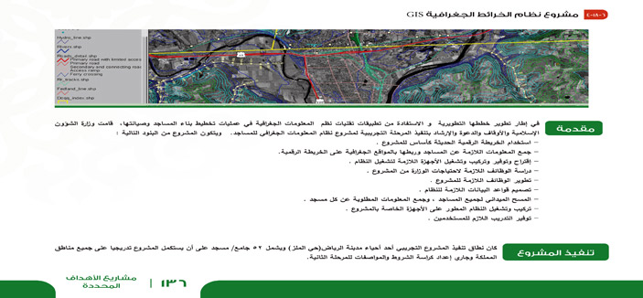 تعتزم وزارة الشؤون الإسلامية والأوقاف والدعوة والإرشاد البدء قريباً في تنفيذ مشروع: (بناء نظام المعلومات الجغرافية) على المساجد حيث تنطبق على هذا النظام مفاهيم ومواصفات نظم المعلومات الجغرافية الشامل والتي تشمل في العادة دراسة الوضع الراهن وتحليل الاحتياجات، وحصر وجمع المخططات المتوفرة لدى الوزارة والجهات الرسمية الأخرى، وتصميم قاعدة البيانات الجغرافية المركزية، والأعمال المساحية الميدانية والرفع المساحي للمساجد، وترقيم المساجد وتجهيز وتركيب اللوحات، وتطوير التطبيقات الجغرافية، والتكامل مع أنظمة الوزارة، وتوريد وتركيب الأجهزة والبرامج والرخص، وتدريب كوادر العمل، ودعم وصيانة وتشغيل النظام.