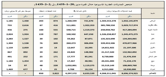رفعت التداولات العقارية في مدينة مكة المكرمة الحركة العقارية بالمملكة خلال الفترة ما بين (28-1-1435) إلى (2-2-1435) ليصل حجم السيولة إلى 12.96 مليار ريال بزيادة 84.7% عن الأسبوع قبل الماضي. يُذكر أن قيمة التداولات العقارية خلال الأسبوع الماضي وصلت إلى أعلى مستوياتها الأسبوعية محلياً خلال العام الماضي 1434هـ، وقد استحوذ القطاع السكني على 67% من قيمة التداولات.
