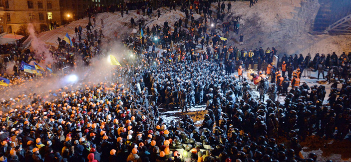 قام مئات العناصر من شرطة مكافحة الشغب الأوكرانية فجر أمس الأربعاء بتفريق المتظاهرين المطالبين بالتقارب مع أوروبا، بالقوة في ساحة الاستقلال في كييف ما أدى إلى تعبئة إضافية للمعارضة وتنديد من دول غربية. وتوافد أكثر من 10 آلاف شخص صباح الأربعاء إلى ساحة الاستقلال على رغم هجوم الشرطة الأوكرانية التي أزالت قبل ساعات قليلة العوائق الموضوعة من جانب المعارضة المؤيّدة للاتحاد الأوروبي. وتشكل ساحة الاستقلال مركز حركة الاحتجاج التي بدأت إثر رفض الرئيس الأوكراني توقيع اتفاق شراكة مع الاتحاد الأوروبي في تشرين الثاني -نوفمبر. وتوقّعت المعارضة مجيء «ملايين» المتظاهرين الأربعاء ضد الرئيس الأوكراني فيكتور يانوكوفتيش فيما نددت الولايات المتحدة بتفريق المتظاهرين وعبر الاتحاد الأوروبي عن «حزنه». وصباح الأربعاء وقعت مواجهات بين الشرطة والمتظاهرين أمام مقر بلدية كييف. وفجر الأربعاء بدأت الشرطة بإزالة العوائق الموضوعة من جانب المتظاهرين في ساحة الاستقلال في كييف وقامت بالسيطرة تدريجياً على المكان. وبدأ عناصر شرطة مكافحة الشغب الذين تجمعوا بالمئات على تخوم المنطقة، بتفريق المتظاهرين مستعينين بدروعهم، بحسب مراسلي فرانس برس في المكان. وقام الشرطيون مستندين إلى قرار قضائي ومطالبين المتظاهرين بالتزام الهدوء، باجتياز العوائق الموضوعة في أنحاء عدة في الساحة التي تحتل موقعاً مركزياً في الحركة الاحتجاجية التي تشهدها البلاد منذ رفض الرئيس فيكتور يانوكوفيتش التوقيع على اتفاق شراكة مع الاتحاد الأوروبي نهاية تشرين الثاني - نوفمبر. كذلك عمدوا إلى فك عدد من الخيم التي كانت منصوبة في الساحة. وقال متحدث باسم الشرطة في العاصمة الأوكرانية لفرانس برس إن «الشرطة تحركت بالتعاون مع الأجهزة الإقليمية لإزالة العوائق التي تعرقل حركة المرور». وأدى المتظاهرون الموجودون في المكان والبالغ عددهم بضع مئات بتلاوة النشيد الوطني الأوكراني ثم عمد ممثلون عن المعارضة موجودون على الساحة إلى تلاوة صلاوات. وصباح الأربعاء وقعت مواجهات بين شرطة مكافحة الشغب ومتظاهرين أمام مقر بلدية جنيف كما قال مراسل وكالة فرانس برس في المكان. واستخدم مئات من عناصر الشرطة الذين كانوا موجودين أمام المبنى الهروات لتفريق المتظاهرين. وبعيد ذلك، توقع الزعيم الأوكراني المعارض ارسيني ياتسينيوك حصول تظاهرة «مليونية» الأربعاء في ساحة الاستقلال.