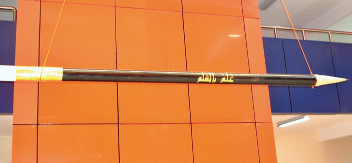 وأضاف حديش: أنه فرغ أيضا من تصميم مجسم لأطول قلم رصاص ، حيث يبلغ طوله 7 أمتار ، وعرضه 8 بوصة، و انطلقت فكرة تصميمه، من أهميته البالغة في مسيرة العلم والمتعلمين، وكذلك ماتضمنته الآية الكريمة ( الذي علم بالقلم * علم الإنسان ما لم يعلم)، موضحاً أنه استخدم في صنعه مادة النحاس، وورق البردي، والمواد البلاستيكية، ومادة الرصاص.
