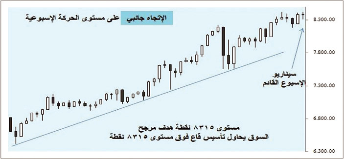 افتتح السوق على صعود قوي وصلت ذروته إلى 8410 نقاط بدعم من سابك التي شاركت بقمة سعرية عند 110.5 ريال والاتصالات أيضا إلى 54 ريالاً لكن الراجحي ومصارف عديدة فضلوا الحياد، وانتهى الأسبوع بنمط شرائي شطب خسائر آخر ثلاثة أسابيع، لكنه لم يتخلص من الحيرة، ونرجح أن السوق يحاول تشييد قاع جديد صلب حتى يستطيع تشييد قمة تفوق 8425 نقطة وعلى الأرجح ستكون سابك في مقدمة الداعمين.