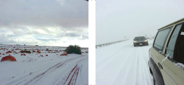 كست الثلوج فجر أمس الجمعة الجبال والمرتفعات وجبال اللوز شمال منطقة تبوك ودنت درجات الحرارة لما دون الصفر المئوي ونجمدت المياه المكشوفة في مناطق البادية كما كست الثلوج مراكز حرس الحدود في قطاعي حالة عمار وحقل في ظل استمرار عمل الدوريات لحرس الحدود على امتداد الشريط الحدودي على مناطق شمال غرب المملكة. ورصدت عدسة الجزيرة من مواقع مختلفة هذه الثلوج المتساقطة أمس الجمعة في ظل تدفق مئات المركبات التي تقل الأسر لمناطق علقان التابعة لمحافظة حقل وجبال اللوز للاستمتاع بهذه الثلوج التي ينتظرها سكان المنطقة كل عام وزوار يحرصون على زياراتها من مختلف مناطق المملكة في ظل تكثيف الدوريات الأمنية لأمن الطرق والشرطة. ووُجد رجال الدفاع المدني في مناطق الثلوج واستنفار لفرق الهلال الأحمر والصحة في مثل هذه الأجواء وسط احتمال مزيد من تساقط الثلوج على مناطق شمال المملكة وسط موجة تشهدها دول الشام والأردن وشمال المملكة في ظل تحذيرات الدفاع المدني من عبور الأودية أو التوغل في مناطق خطرة ومرتفعة كجبال اللوز والقيادة بحذر في ظل متابعة صاحب السمو الملكي الأمير فهد بن سلطان بن عبدالعزيز أمير منطقة تبوك وتوجيهاته الكريمة بتقديم المساعدات والعون لكل مواطن.