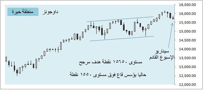 داوجونز بتأثير من مخاوف خفض التيسير الكمي أصر على الهبوط إلى مستوى 15703 نقطة وإنهاء الأسبوع بنمط بيعي نتيجة تراجع شهية المخاطرة والترقب، لكن على المدى المتوسط نجد أن من مصلحة المؤشر العودة لتأسيس قاع عند مستوى 15550 نقطة وهو سقف قناة منطقة الحيرة، هذا السيناريو إن حدث سيكون حاجز 17000 نقطة هدفا مرجحا جداً خصوصا أن السوق تخلص من المشكلة السياسية بشأن الميزانية الشهرية للدولة .