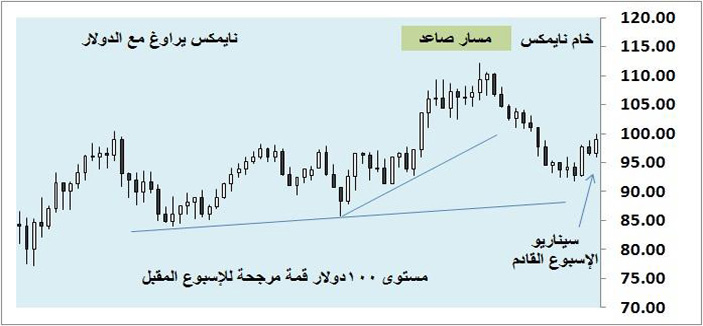 تمكن خام نايمكس من زيارة مستوى 99 دولارا لكنه لم ينجح في المحافظة على مكاسبه لقوة الدولار ومخاوف من خفض التيسير الكمي مما جعله يهبط إلى مستوى قريب من 96 دولارا وإنهاء الأسبوع بنمط بيعي لكن ضمن المسار الصاعد حتى الآن إلا أنه دخل في حيرة على الفاصل اليومي، ونرجح الأسبوع المقبل أن يؤسس دعما جيدا عند 96 دولارا وتشييد قمة قريبة من الحاجز 100 دولار بشرط استمرار ضعف الدولار أمام اليورو