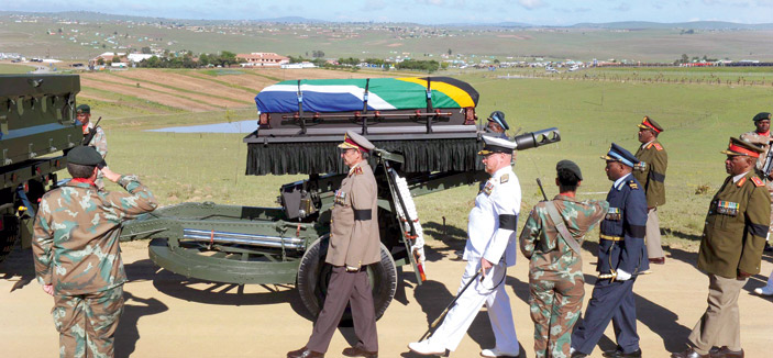في هذه الأثناء حلّقت مروحيات عسكرية وطائرات حربية فوق الموقع وأطلقت المدافع طلقاتها، أما كاميرات التلفزيونات التي كانت تنقل وقائع وداع بطل النضال ضد نظام الفصل العنصري في الصباح، فتمكنت من متابعة نعشه حتى أرض أجداده على بعد مئات الأمتار. وانسجاماً مع رغبات العائلة ابتعدت ساعة دفنه، فيما استمرت الطائرات والمروحيات في التحليق، ثم عادت بعد ثوانٍ إلى المكان الذي بات خاوياً وحيث كان يوضع نعش أول رئيس أسود للبلاد، وقد توارت بعد ذلك لتترك المكان للمراسم الدينية والتقليدية في حضور 450 مدعواً تم انتقاؤهم بعناية كبيرة.