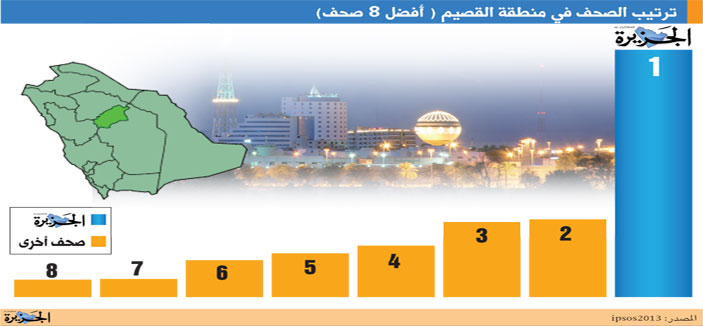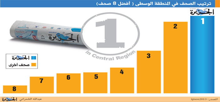 حققت صحيفة الجزيرة إنجازاً جديداً بحصولها على الترتيب الأول في المقروئية والانتشار على مستوى المنطقة الوسطى بين الصحف في المملكة العربية السعودية، للعام الثاني على التوالي. وأظهرت دراسة أصدرتها شركة إبسوس لأبحاث ودراسات المقروئية Ipsos لعام 2013 شملت جميع الصحف اليومية التي توزع في المملكة حصول صحيفة الجزيرة على الترتيب الأول في المقروئية بالمنطقة الوسطى بين الصحف في المملكة العربية السعودية. كما أكدت الدراسة حصول صحيفة الجزيرة على المركز الثالث في ترتيب الصحف مقروئية على مستوى كافة مناطق المملكة العربية السعودية. كما تبوأت الجزيرة مراكز متقدمة في عدة مناطق أخرى، إذ واصلت احتلالها المرتبة الاولى على مستوى المقروئية في منطقة القصيم ومنطقة حائل.