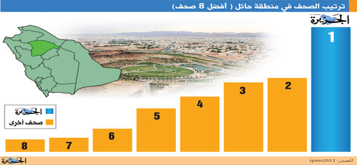 تتقدم صحيفة الجزيرة بالتهنئة إلى زميلاتها الصحف الفائزة بالمراكز الأولى في المقروئية ببقية المناطق الأخرى في المملكة العربية السعودية حسب دراسة إبسوس 2013 وتتمنى الجزيرة أن يكون للصحف الأخرى التي لم يحالفها التوفيق نصيب من التقدم في نتائج السنوات القادمة.