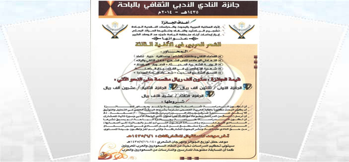 أقر مجلس إدارة نادي الباحة الأدبي عنوان وأهداف وشروط جائزته الإبداعية لهذا العام بقيمة تزيد عن ستين ألف ريال موزعة على الفائزين بالمراكز الثلاثة الأولى.