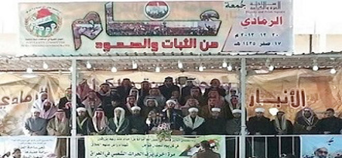 وفي سياق متصل شارك مئات الآلاف من أهالي محافظة الأنبار في صلاة الجمعة الموحدة بساحتي الاعتصام العزة والكرامة في الرمادي وساحة الشهداء في الفلوجة تحت شعار (عام من الثبات والصمود)، التي وافقت الذكرى السنوية الأولى للاعتصامات في ست محافظات عراقية. ووجّه خطيب الجمعة في الفلوجة الشيخ حسين العميري رسالتين، الأولى إلى السياسيين (السنة) بالقول: لا نريد عضلات كلامية، بل نريد حلاً ومشروع خلاص. وتابع الشيخ العميري: إن السياسيين لم يستطيعوا تخليص أنفسهم من الملفات والاتهامات، وإن أكبر منصب من حصة (أهل السنة) حكم عليه بالإعدام، فيما يقبع أكثر من 100 ألف معتقل خلف قضبان السجون، وهناك عشرون ألف عائلة مهجرة من حزام بغداد وديالى. ووجّه خطيب الفلوجة رسالته الثانية إلى كبار علماء (السنة) مطالباً إياهم بـ»الجلوس والاتفاق على مشروع متكامل لوضع حد لما يجري من انتهاكات بحق أهل السنة، والخروج بموقف شرعي موحد تجاه المشاركة في الانتخابات المقبلة».