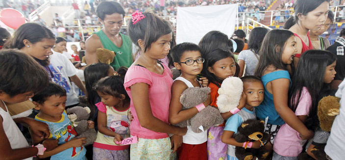 - أطفال فيلبينيون ناجون من إعصار هيان َيصطفُّون لأخذ هدايا مقدمة لهم من جمعيات خيرية. (رويترز)