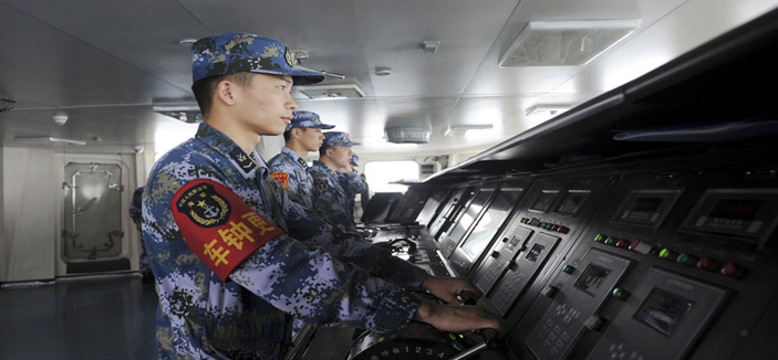 - جنود من البحرية الصينية من على متن حاملةِ طائرات الصين الأولى التي تعرضت لمحاولة اصطدام مع سفينة أمريكية قبل أيام عدة. (رويترز)